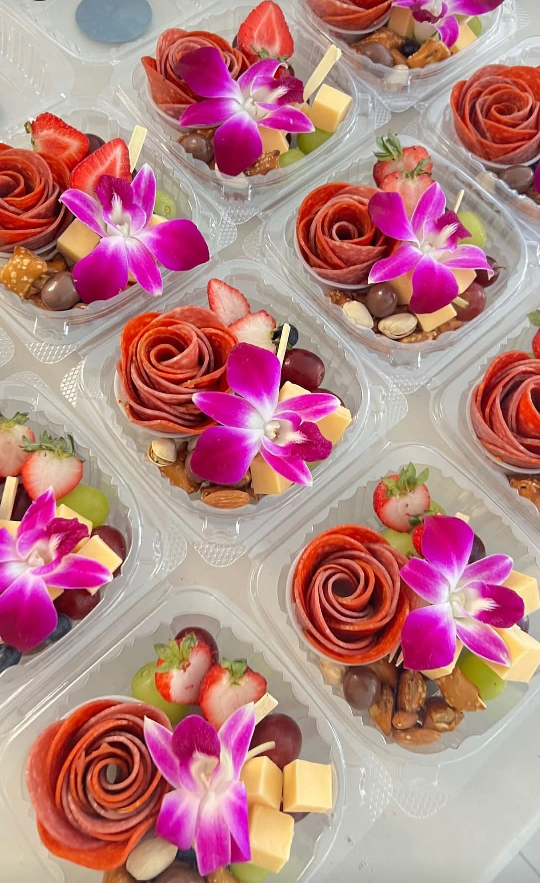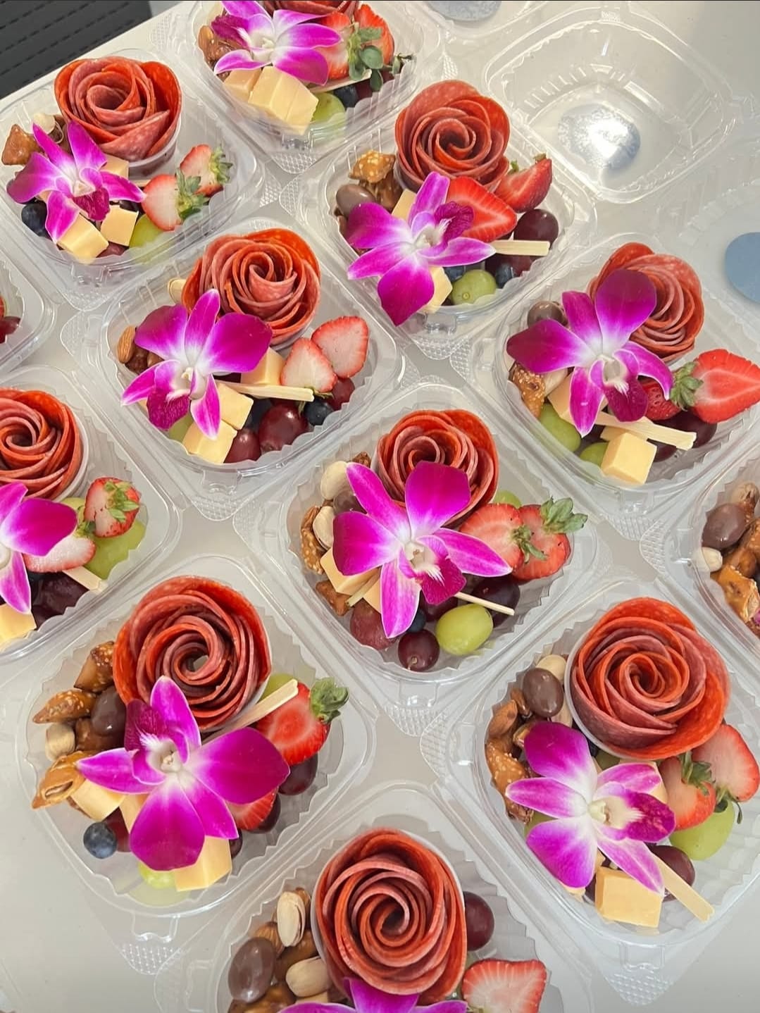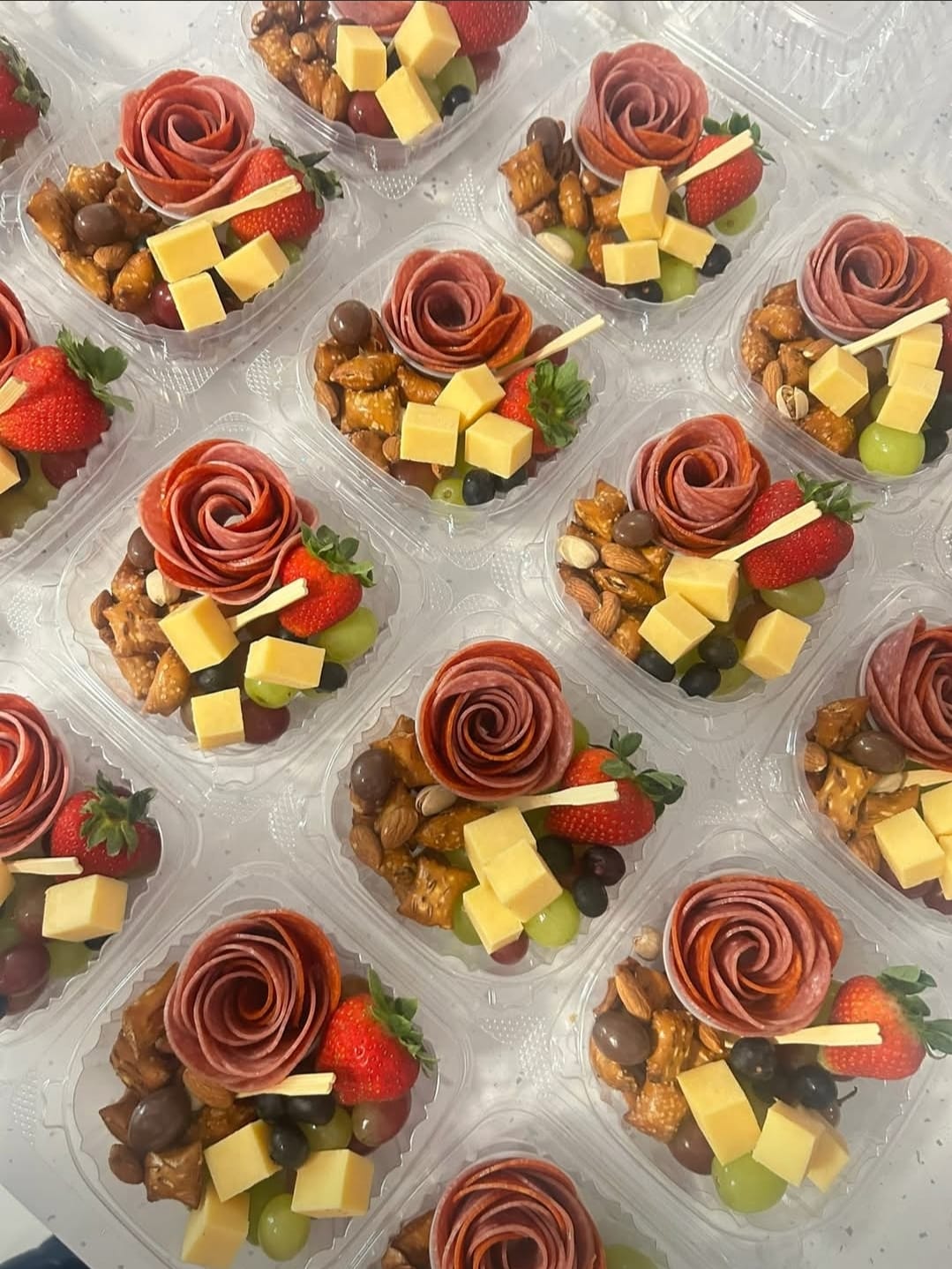 Meats, Cheese cubes, fresh fruits, nuts & sweets.